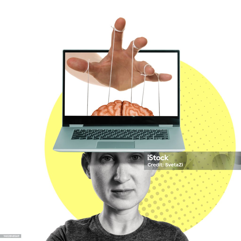 AI being confused concept collage art. Human with TV Head representing artificial intelligence not able to understand the command given. Black and white illustration isolated on red background.